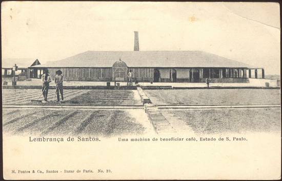 Para os cartões postais do início do século XX, Santos era referência para todo o estado de São Paulo, como hinterlândia do porto de Santos, como se vê neste postal da época, em que a imagem de "uma machina de beneficiar café", numa fazenda do interior paulista era apresentada como "lembrança de Santos", para os turistas que passavam por este porto. O cartão da Union Postale Universelle foi produzido por M. Pontes & Co., de Santos, para comercialização no Bazar de Paris (peça número 23, sem carimbo dos Correios):
