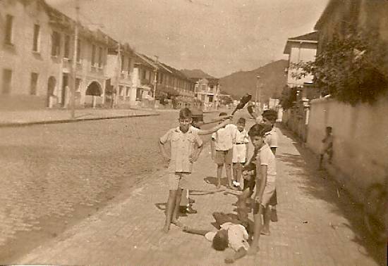 na Vila Belmiro. Em 1944, crianças brincam na sossegada Rua Adolfo Assis. O conjunto de casas visto na calçada oposta ainda se conserva no local, como relata o estagiário de História na Fundação Arquivo e Memória de