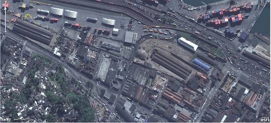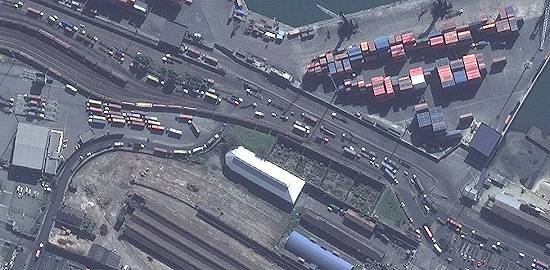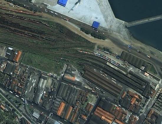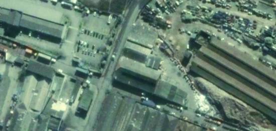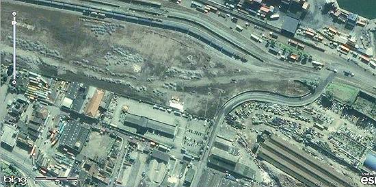 EyeEarth, foi feita por volta de 2008, mas podia ser consultada na Internet em 9/1/2012. Note-se que a ferrovia ainda não está seccionada, entre