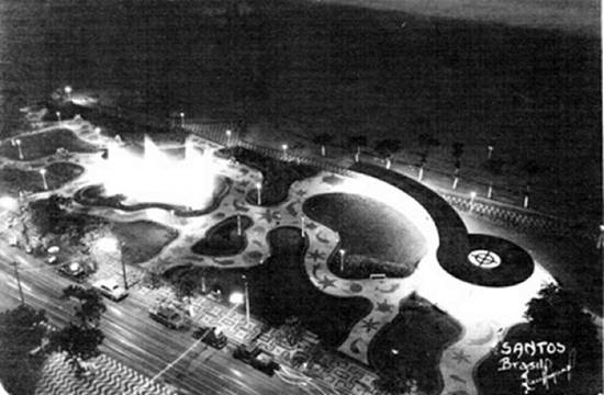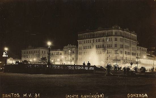 Tendo a fonte luminosa Nove de Julho em primeiro plano, uma vista da zona hoteleira do Gonzaga, com os hotéis Atlântico, Bandeirantes, Belvedere e Avenida Palace, em
