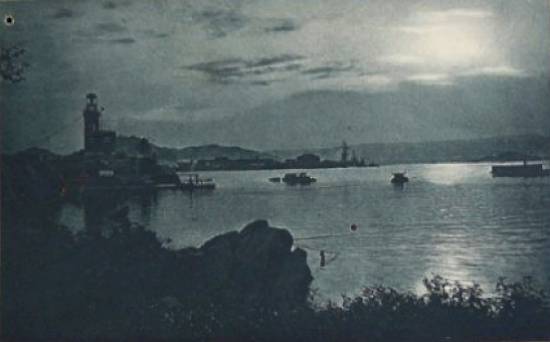 Mas algumas imagens de Santos e seu porto ficaram para a posteridade. A começar por esta imagem com aparência de noturna, mas obtida por escurecimento da lente, tomada desde as imediações do fortim do Itapema (que é visto