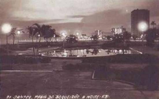 Uma vista noturna da Praia do Boqueirão nos anos 1950, com o espelho d'água e um fundo marcado pelos raros prédios então erguidos, em um cartão postal que em princípios de 2008 era negociado no