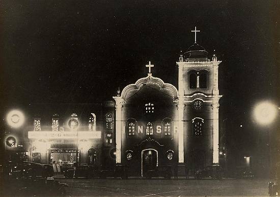 Possivelmente em dezembro de 1930, uma rara imagem noturna no Centro: a Igreja de Nossa Senhora do Rosário, então recém-reconstruída e com