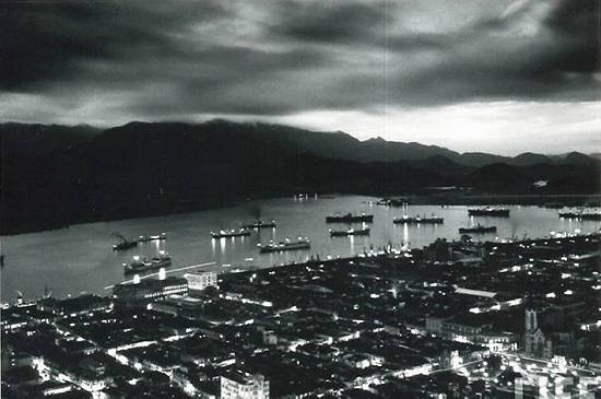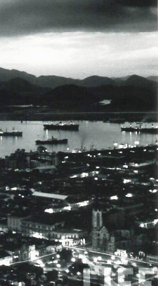 Recordar, mostra o centro de Santos ao anoitecer, com o porto e o fundeadouro de navios (que por razões de segurança deixou de ser feito nessa área a partir da década seguinte, em