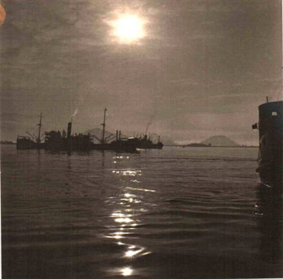 "PORTO DE SANTOS - 1964. No amanhecer, o cargueiro Paranagauá do Lloyd Brasileiro passando nas proximidades da linha da balsa Santos-Guarujá. Fazia parte de um quarteto