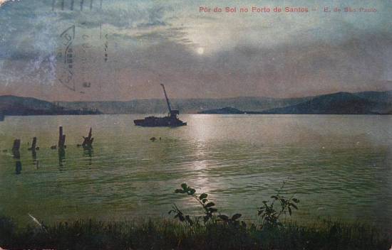Este cartão postal - 'Por do Sol no Porto de Santos - E. de São Paulo' - foi circulado na década de1920 (19/6/2*), conforme o carimbo dos Correios: