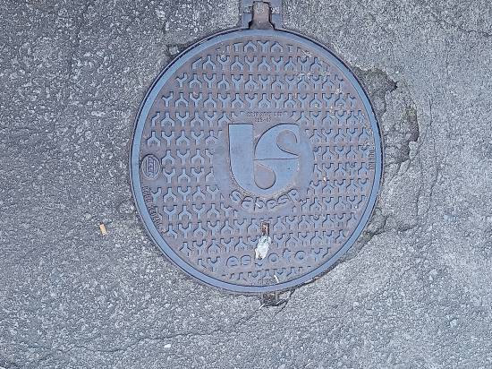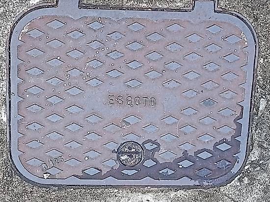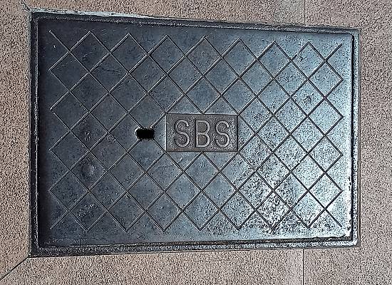Acesso a galerias de esgoto da empresa Saneamento Básico do Estado de São Paulo S.A. (Sabesp), tendo sobre o logo a data 22/10/2007. A Sabesp foi criada pela lei estadual nº 119 de 29/6/1973), como sucessora, entre outras, da Companhia de Saneamento da Baixada Santista (SBS), criada pelo decreto-lei estadual nº 23 de 23/9/1969, e do Serviço de Água de Santos e Cubatão (SASC)