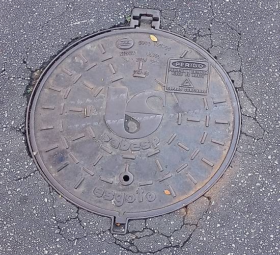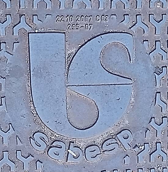 O tempo vai passando, as tampas em ferro fundido fáceis de roubar e vender para depósitos de ferro-velho vão sendo substituídas por outras em concreto, o cimento usado no conserto de calçadas ou o asfalto nas ruas acabam recobrindo antigas tampas, dificultando a leitura das inscrições. Como neste caso, em que parece ser lido o ano 1971 na parte inferior e uma sigla de empresa pública (que não seriam Sabesp nem Telesp, já que estas surgiram em 1973). Fica o desafio para que o leitor prossiga na pesquisa. Encontrará decerto muitas outras, talvez bem conservadas ainda... bem debaixo de seus pés.
