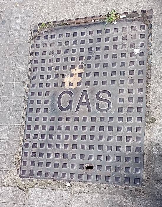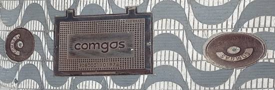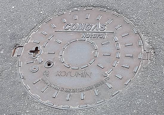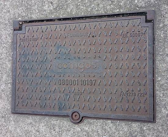Tampa redonda de poço de inspeção de instalações de distribuição de gás natural de petróleo da empresa Comgas, no leito carroçável da Rua Frei Gaspar, 85, no centro de Santos. A peça, modelo Korumin, foi produzida pela PAM (marca mundial da Companhia Metalúrgica Barbará/Saint-Gobain Canalização, com a inscrição (além de citar o telefone 0800 da Comgas) mencionando seguir a norma brasileira NBR 10160 (de 2005), a ckasse de resistência D-400 para ruas com trânsito de veículos e a norma europeia EN-124, promulgada em 29/9/1994