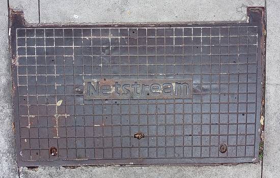 Tampa retangular de poço de inspeção de instalações da empresa de telecomunicações NetStream, na calçada da confluência da Rua Augusto Severo com a Praça Barão do Rio Branco. A Netstream é uma empresa de telecomunicações (voz, dados, vídeo e internet em banda larga por fibra ótica) para clientes corpotativos, cujas operações no Brasil foram adquiridas pela estadunidense AT&T em agosto de 1999