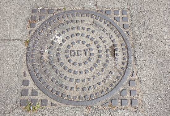 Tampão circular de poço de inspeção do Departamento de Correios e Telégrafos (DCT), criado em 1931 pela fusão da Repartição-Geral dos Telégrafos com Diretoria-Geral dos Correios. A DCT foi em 1969 sucedida pela Empresa Brasileira de Correios e Telégrafos (ECT). O tampão foi produzido pela Fundição Americana, do Rio de Janeiro/RJ, e está sittuado na calçada do Banco do Brasil da confluência das ruas XV de Novembro e Augusto Severo com a Praça Barão do Rio Branco
