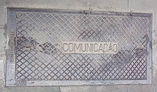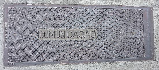 Tampa retangular de poço de inspeção de instalações subterrâneas de telecomunicações, sem identificação da empresa do setor, no modelo CL-125 da fundição Fuminas (de Cotia/SP) - que já trocou seu endereço Web para www.fuminas.com.br. A peça mais antiga está instalada na calçada da Ruax, enquanto a mais recente tem vários exemplares instalados em ruas do Centro, como a Rua Riachuelo, próximo aos números 72 e 74