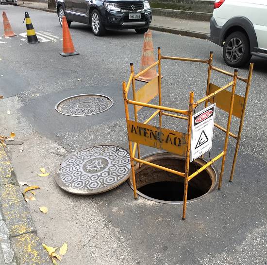 Existe um mundo de equipamentos e atividades no subsolo das cidades como Santos. As janelas para esse mundo são os poços de visita existentes em calçadas e ruas. Como este, na Avenida Washington Luiz, 223, defronte à central de telefonia da antiga Telesp/Telefônica/Vivo, na esquina com a avenida Rodrigues Alves. Mas não tente visitar esses locais: a entrada é proibida pois o risco é de morte, como avisam as placas, inclusive porque o espaço é exíguo e confinado. Apenas lembre: esse mundo subterrâneo existe: ele é que garante o funcionamento de muitos equipamentos na superfície do solo