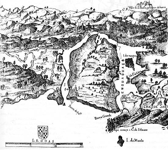 "Enguaguaçu apresentava o seguinte traçado, em confronto com a atualidade: três outeiros (morros) consecutivos e do lado oposto ao estuário (porto); quatro córregos, desaguando todos no estuário (lagamar):