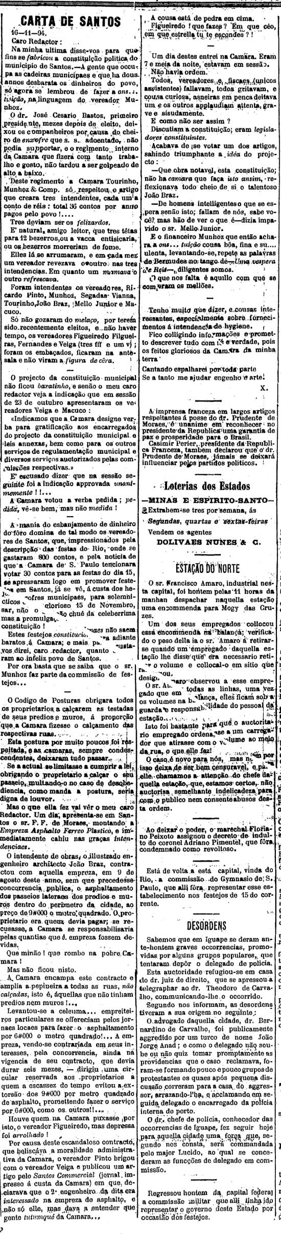 Uma forte crítica aos vereadores santistas foi publicada pelo jornal paulistano O Estado de São Paulo, na edição de 18 de novembro de 1894, em sua primeira página (Acervo Estadão - ortografia atualizada nesta transcrição):