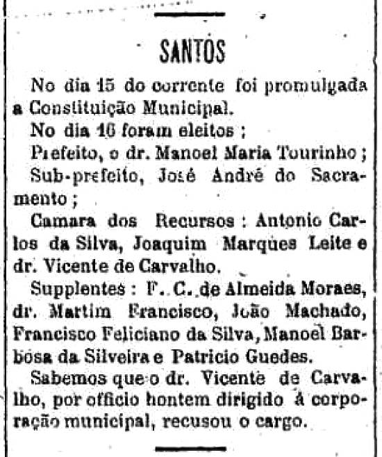 Sabemos que o dr. Vicente de Carvalho, por ofício ontem dirigido à corporação municipal, recusou o cargo. |