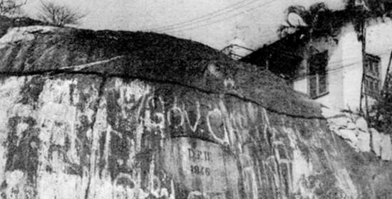A rocha, com a inscrição D. P. II - 1846, e o mosteiro de São Bento
