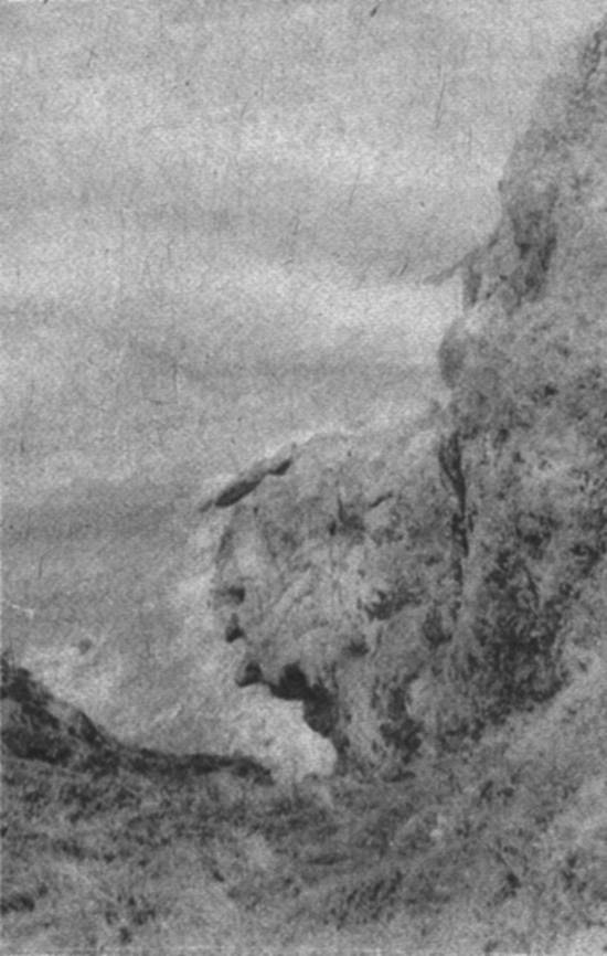 visto. Ao limiar da porta que está encravada na face ocidental do morro, um vastíssimo salão com bancos de pedra em toda a volta; as paredes, de