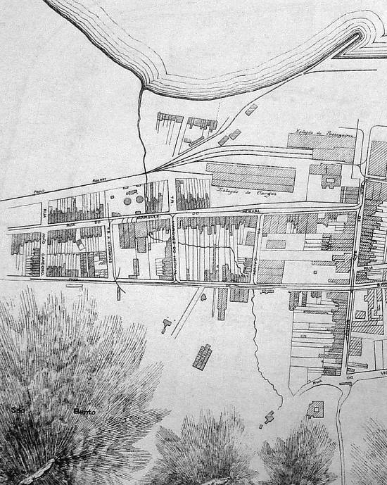 | Esta planta de 1895 mostra a posição precisa do Rio São Bento em relação ao