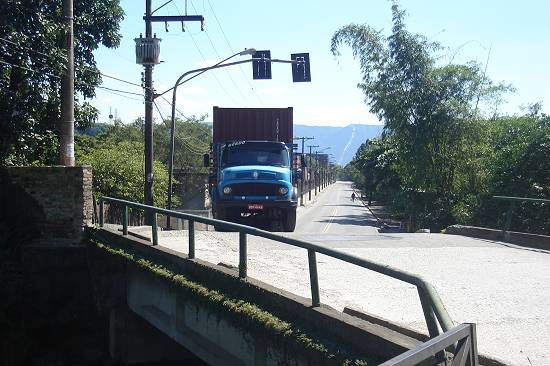 de Carvalho. A primeira imagem está orientada na direção de São Vicente, e após a passagem da ponte a foto seguinte é no sentido inverso, mostrando