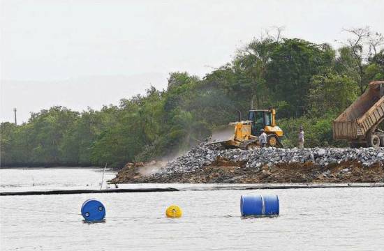 Segundo os representantes das empresas, as pedras colocadas sobre o rio servem de suporte para uma máquina que realiza a dragagem, pois o leito do rio é muito instável. As barcaças estão ali para garantir a segurança.
