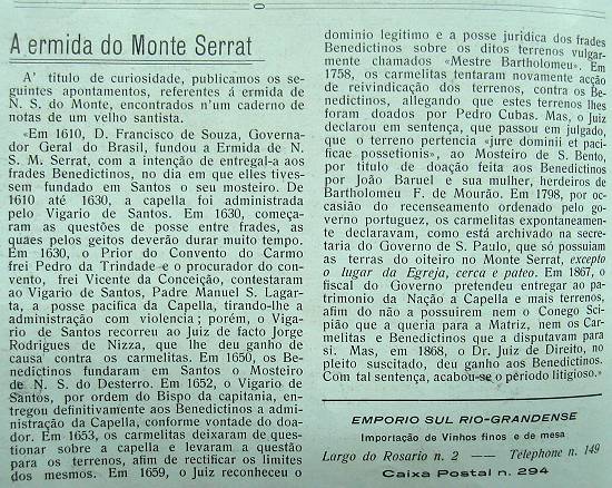 "Em 1650, os beneditinos fundaram em Santos o Mosteiro de N. S. do Desterro. Em 1652, o vigário de