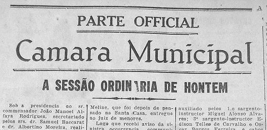 Sob a presidência do sr. comendador João Manoel Alfaya Rodrigues, secretariado pelos srs. dr. Samuel Baccarat e dr. Albertino Moreira, realizou-se ontem, às dez horas, a sessão ordinária da Câmara Municipal.