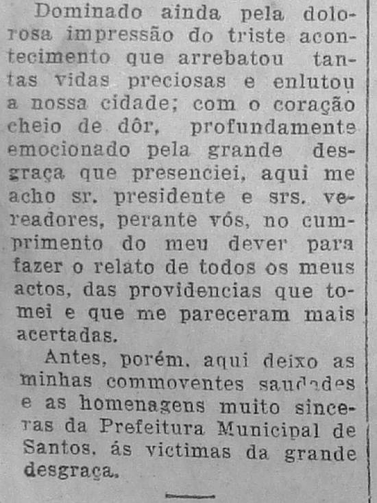 "Dominado ainda pela dolorosa impressão do triste acontecimento que arrebatou tantas vidas preciosas e enlutou a nossa cidade; com o coração cheio de dor, profundamente emocionado pela grande desgraça que presenciei, aqui me acho, sr. presidente e srs. vereadores, perante vós, no cumprimento do meu dever para fazer o relato de todos os meus atos, das providências que tomei e que me pareceram mais acertadas.