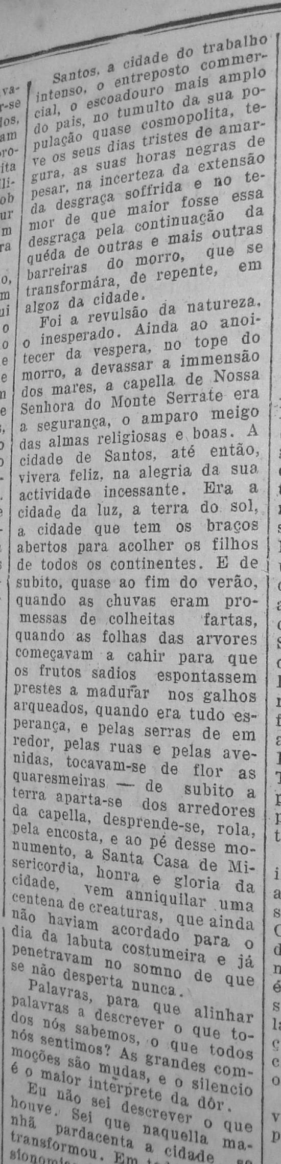 Santos, a cidade do trabalho intenso, o entreposto comercial, o escoadouro mais amplo do país, no tumulto da sua população quase cosmopolita, teve os seus dias tristes de amargura, as suas horas negras de pesar, na incerteza da extensão da desgraça sofrida e o temor de que maior fosse essa desgraça pela continuação da queda de outras e mais outras barreiras do morro, que se transformara, de repente, em algoz da cidade.