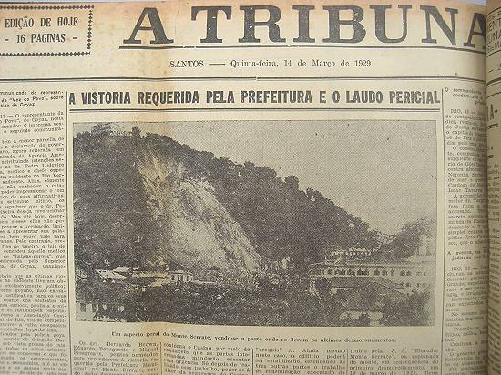 O grande desmoronamento da encosta do Monte Serrate em 1928 foi tema constante na imprensa por bastante tempo, como nesta matéria publicada um ano depois (numa quinta-feira, 14 de março de 1929) pelo jornal santista A Tribuna, em sua página 16, a última dessa edição (ortografia atualizada nesta transcrição):