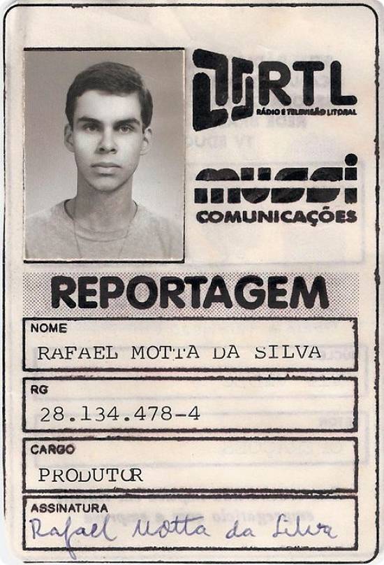 Carteira de Rafael Motta na rádio Litoral FM em 1999/2000. "O documento foi emitido pouco após a mudança da sede da emissora, que ficava na Av. Capitão-Mor Aguiar, 756, no Parque Bitaru, para a Av. Manoel da Nóbrega, 1275, no Itararé, em São Vicente"