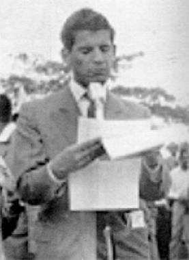 Reynaldo Tavares em 1948, na praia santista do Gonzaga, pela PRG-5 Rádio Atlântica de Santos, na abertura dos Jogos Abertos do Interior. À direita, capa do seu livro de 1997