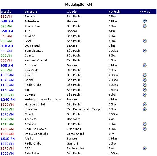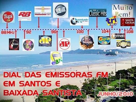 Em julho de 2010, assim se apresentava o espectro de frequências principais em Frequência Modulada (FM) captado na Baixada Santista, segundo o blogue Muito Bem!, do radialista Emilio Pechini:
