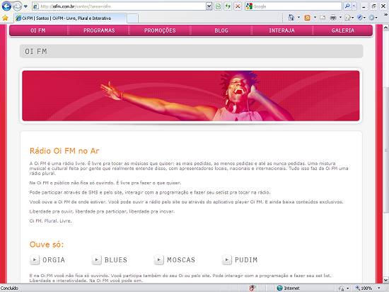 A nova emissora, ligada à empresa de telefonia celular OI já colocou no ar o site da OI FM - Santos, conforme a imagem abaixo, que foi capturada do site http://www.oifm.com.br/sp/santos/ (em 16/09/2008-10:54):