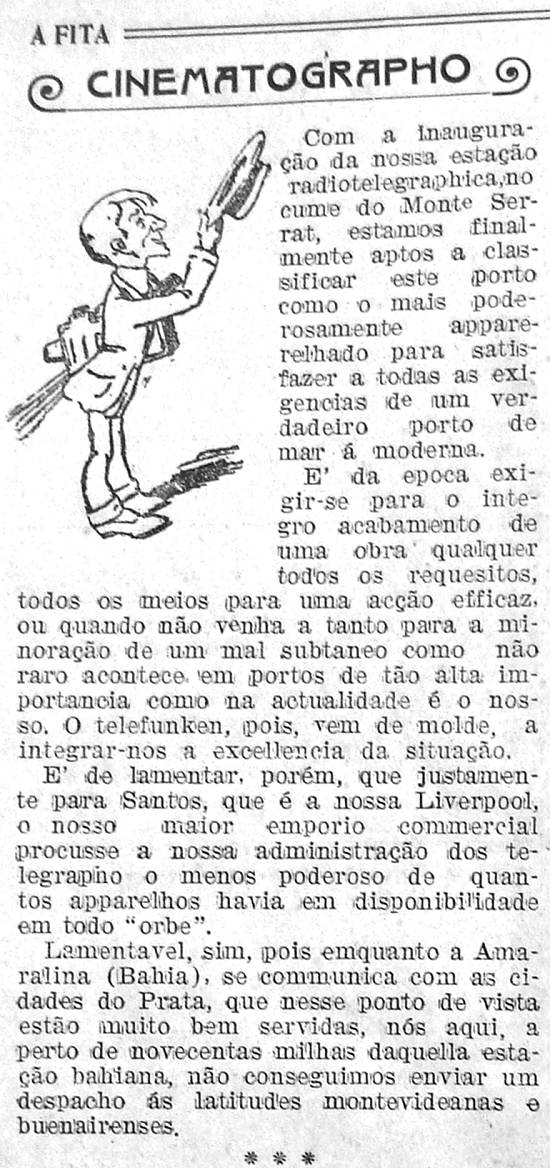 É de lamentar, porém, que justamente para Santos, que é a nossa Liverpool, o nosso maior empório comercial procu[ra]sse a nossa administração dos telégrafos o menos poderoso de quantos aparelhos havia em disponibilidade em toda urbe.