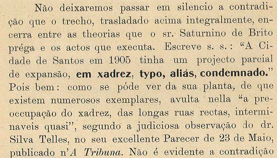 Não deixaremos passar em silêncio a contradição que o trecho, trasladado acima integralmente, encerra entre as teorias que o sr. Saturnino de Brito prega e os atos que executa. Escreve s.s.: "A Cidade de Santos em 1905 tinha um projeto parcial de expansão, em xadrez, tipo, aliás, condenado". Pois bem: como se pode ver da sua planta, de que existem numerosos exemplares, avulta nela "a preocupação do xadrez, nas longas ruas retas, intermináveis quase", segundo a judiciosa observação do dr. Silva Telles, no seu excelente Parecer de 23 de maio, publicado n'A Tribuna. Não é evidente a contradição entre as idéias que prega e os atos que pratica? Pois Augusto Comte, mestre do sr. Saturnino de Brito, estabeleceu que a falta de concordância entre os pensamentos e os atos - é o característico flagrante da alienação mental.