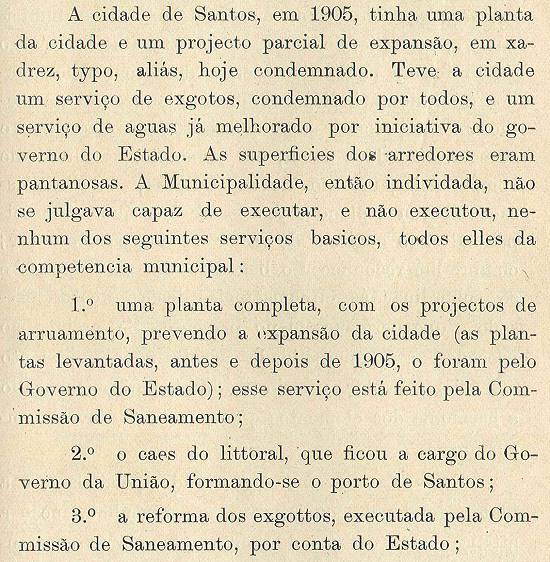 A cidade de Santos, em 1905, tinha uma planta da cidade e um projeto parcial de expansão, em xadrez, tipo, aliás, hoje condenado. Teve a cidade um serviço de esgotos, condenado por todos, e um serviço de águas já melhorado por iniciativa do governo do Estado. As superfícies dos arredores eram pantanosas. A Municipalidade, então endividada, não se julgava capaz de executar, e não executou, nenhum dos serviços básicos, todos eles da competência municipal: