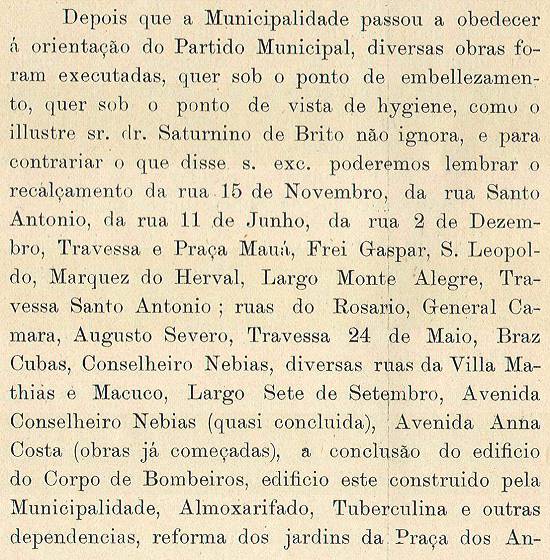 seus cofres o Corpo de Bombeiros e Banda de Música, Assistência Pública, Limpeza Pública, Iluminação Pública (na cidade, Barra, Macuco, Vila