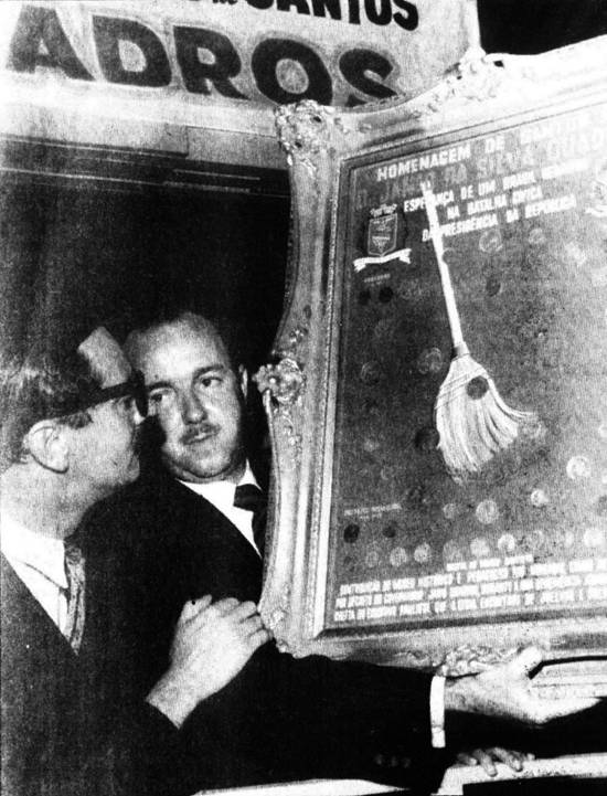 Candidato ao Governo do Estado, Jânio popularizou a vassoura como símbolo do combate à corrupção. Na foto, uma homenagem em Santos
