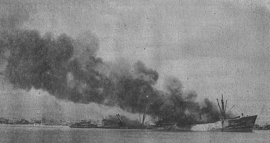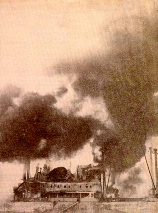 instalações do porto, é puxado para o meio do estuário e encalhado perto da margem esquerda, na altura do Armazém 25.
