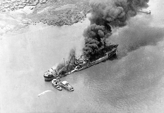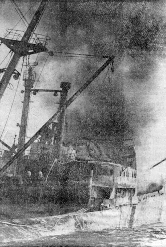 O navio em chamas, já rebocado para o meio do Estuário, em 9 de janeiro de 1974