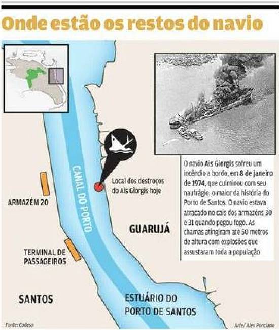 seu naufrágio, o maior da história do Porto de Santos. O navio estava atracado no cais dos armazéns 30 e 31 quando pegou fogo. As chamas atingiram