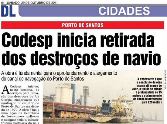 retirada dos restos do navio Ais Giorgis, submersos no canal de navegação do Porto de Santos há quase 40 anos, terá início na primeira