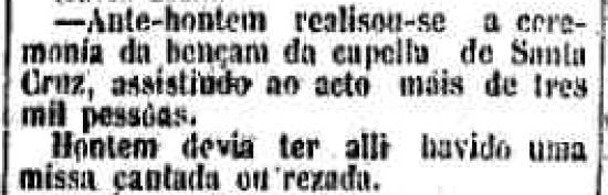 "- Ante-hontem realisou-se a ceremonia da bençam da capella de Santa Cruz, assistindo ao acto mais de tres mil pessoas. Hontem devia ter alli havido uma missa cantada ou rezada".