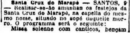 "Santa Cruz do Marapé - SANTOS, 9 - Realisar-se-ao amanhan os festejos da Santa Cruz do Marapé, na capella do mesmo nome, situado no sopé daquele morro. O programa será o seguinte: Missa solenne com canticos, bençam do SS. Sacramento, pela manhan: durante o dia leilão de prendas: á noite ladainha. Será tambem queimado vistoso fogo de artificio."