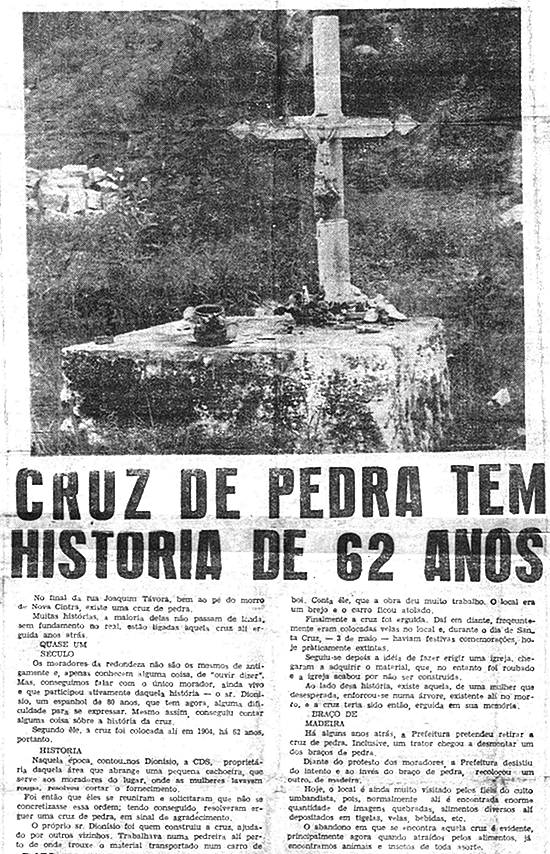 Isso foi há 55 anos; tudo mudou. Hoje, no passo curto dos 80 anos, o velho Ângelo Lopes Parada recolhe-se à sombra de uma árvore e se recorda de fatos ocorridos no bairro, com antigos moradores. Todos estão contentes porque amanhã, Dia de Santa Cruz, haverá uma grande festa junto à misteriosa cruz de pedra, no final da Rua Joaquim Távora. "Será uma comemoração como nos velhos tempos", diz, alegre, José Limeres, o Juca, da comissão coordenadora do festejo.