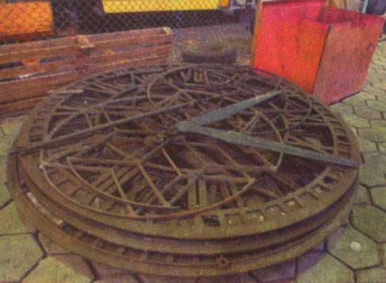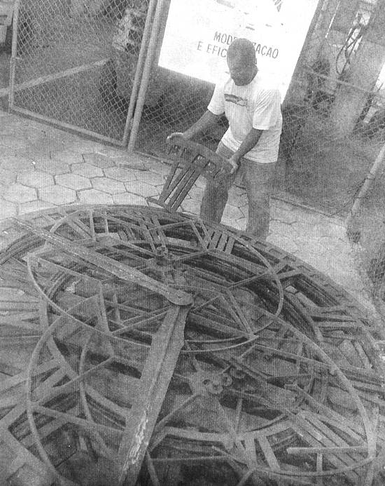 metros de diâmetro. Um caixote de madeira acomoda algumas peças. Outras, como os ponteiros de quase 1,5 metro de comprimento, estão pelo chão, como