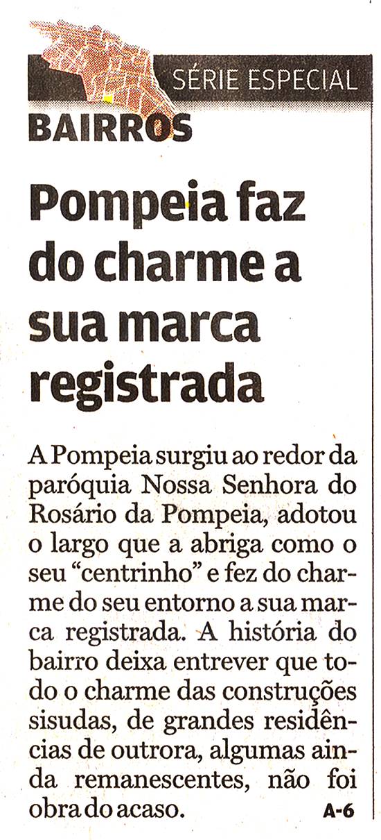 POMPÉIA FAZ DO CHARME A SUA MARCA REGISTRADA - A Pompéia surgiu ao redor da paróquia Nossa Senhora do Rosário da Pompéia, adotou o largo que a abriga como o seu "centrinho" e fez do charme do seu entorno a sua marca registrada. A história do bairro deixa entrever que todo o charme das construções sisudas, de grandes residências de outrora, algumas ainda remanescentes, não foi obra do acaso