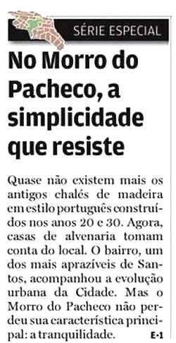 NO MORRO DO PACHECO, A SIMPLICIDADE QUE RESISTE - Quase não existem mais os antigos chalés de madeira em estilo português construídos nos anos 20 e 30. Agora, casas de alvenaria tomam conta do local. O bairro, um dos mais aprazíveis de Santos, acompanhou a evolução urbana da Cidade. Mas o Morro do Pacheco não perdeu sua característica principal: a tranqüilidade