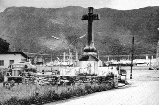Cruzeiro Quinhentista, reconstruído no início do Caminho do Mar, em Cubatão, cerca de 1980 Foto: Poliantéia Santista, volume I, 1986, Ed. Caudex, S.Vicente/SP